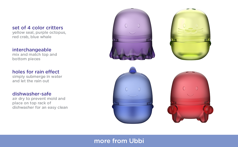 A set of 4 color critters. Interchange by mixing and matching the top and bottom pieces then fill up with water and watch the rain fall out.