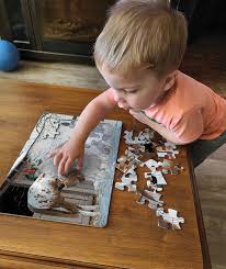 A tray puzzle is durable inlaid pieces in a tray with definitive outlines underneath to help identify where each piece goes. The large pieces makes it easy for hands to grasp and allows for those needing more visual cues to see a greater portion of the image per piece.
