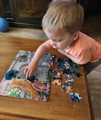 A tray puzzle is durable inlaid pieces in a tray with definitive outlines underneath to help identify where each piece goes. The large pieces makes it easy for hands to grasp and allows for those needing more visual cues to see a greater portion of the image per piece.